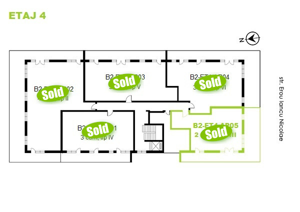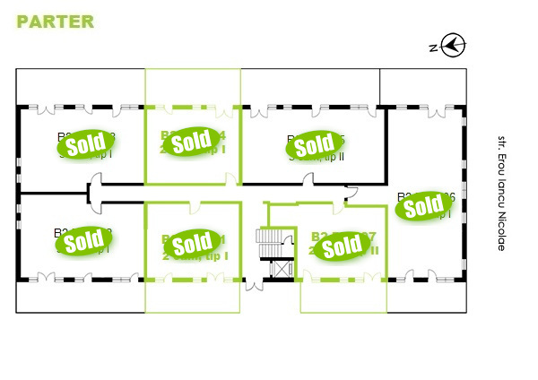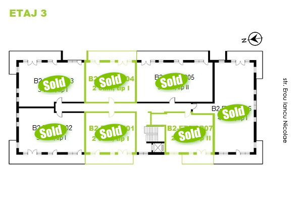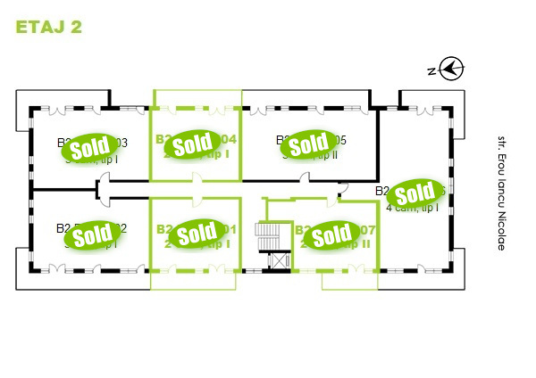 Click pe numărul de apartament marcat cu verde din schițe pentru a vizualiza compartimentarea interioară a apartamentelor cu 2 camere disponibile pe fiecare etaj din imobilul B2. Apartamentele marcate cu sold nu mai sunt disponibile.